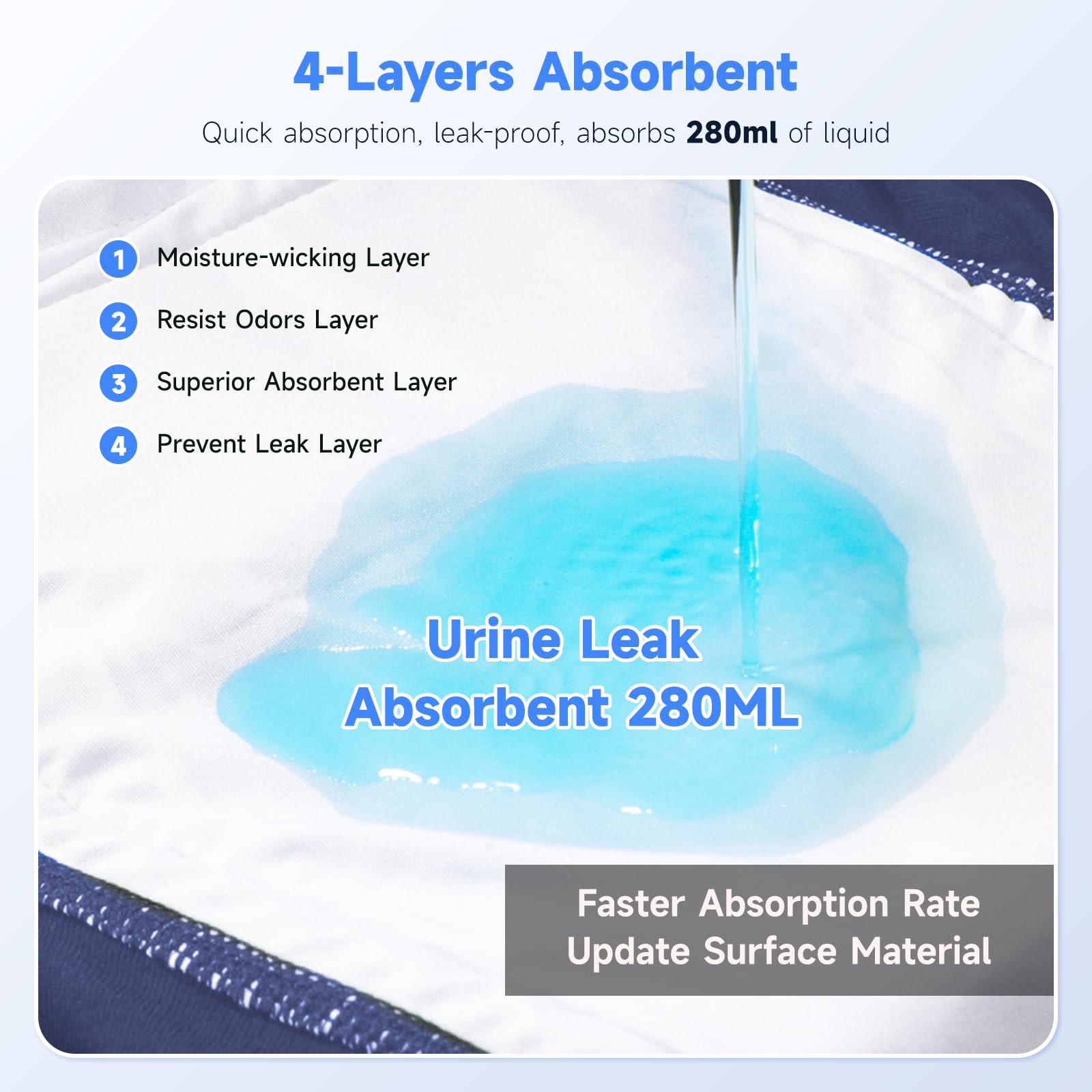 - HIGH ABSORPTION CAPACITY: Features a built-in absorbent pad capable of holding up to 280ml of fluid, making these boxer briefs ideal for moderate to heavy incontinence control. The multi-layer rapid absorption structure keeps the surface dry and locks in moisture to ensure you feel secure and confident throughout the day