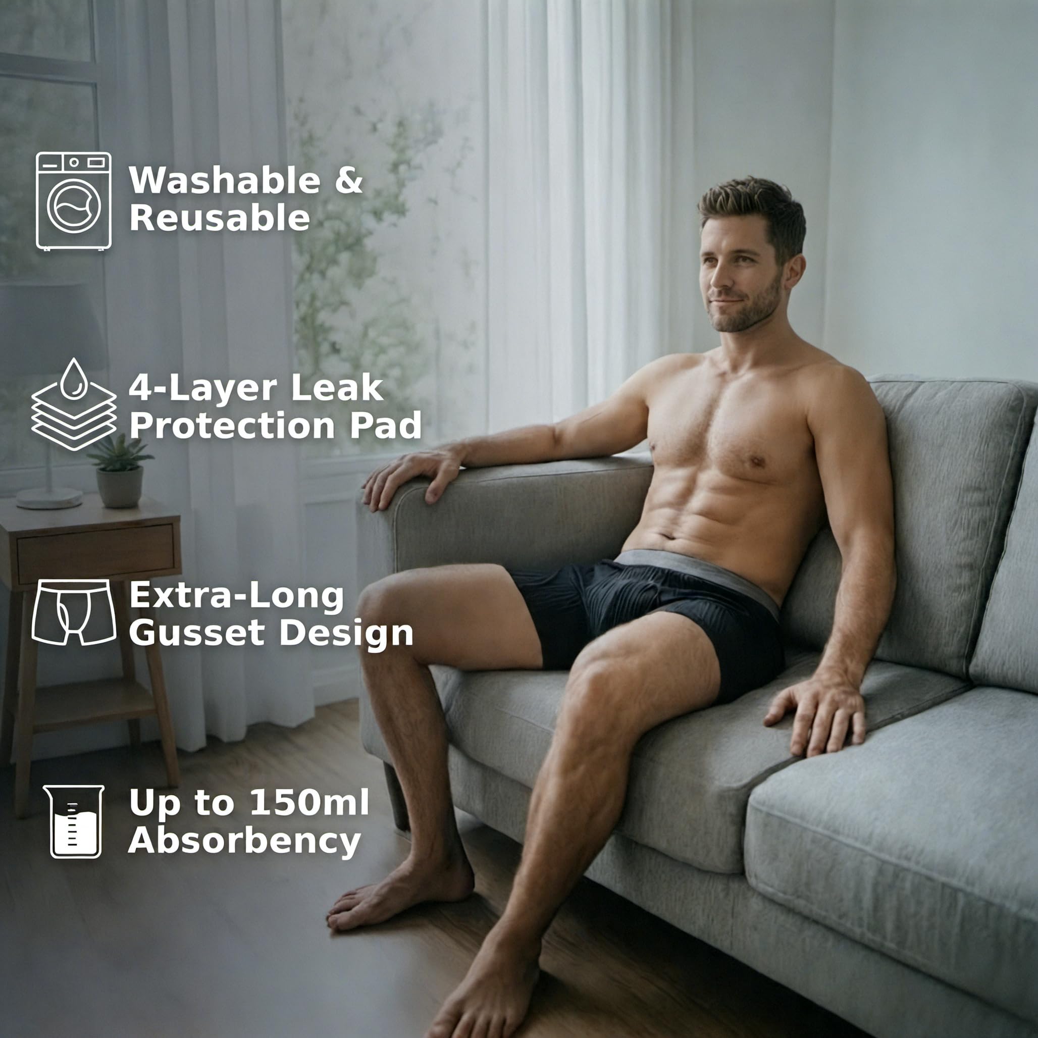 - Daily Protection for Light to Moderate Leaks - Designed for daytime wear, this men’s washable incontinence underwear provides discreet absorbent support for light to moderate bladder leaks with up to 150ml absorbency.